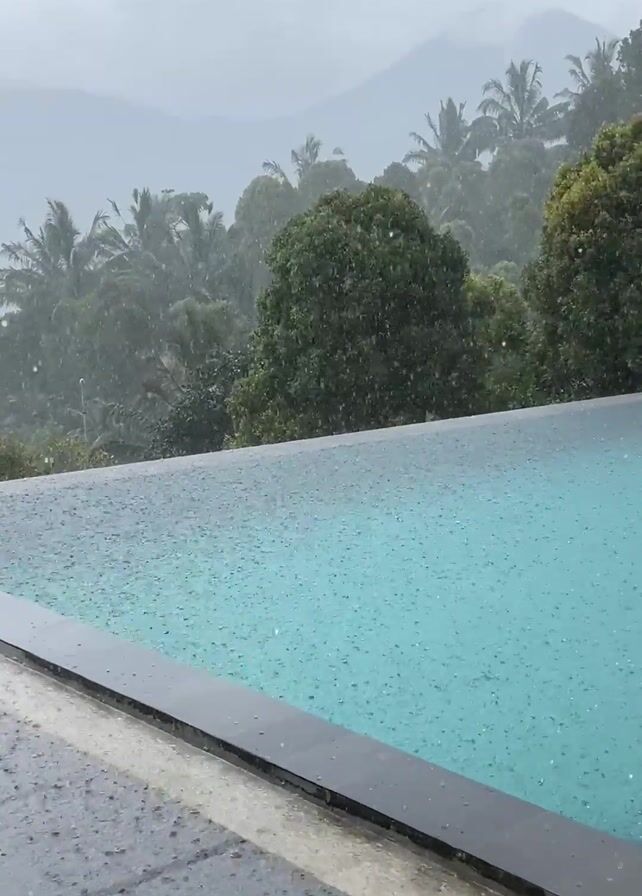 scenic infinity pool being heavily rained on. The pool is a turquoise color, and the dark grey pool deck is also wet. In the background, there is a misty, mountainous landscape covered in lush green trees and palm trees. The sky is overcast and grey. The heavy rainfall creates ripples on the surface of the pool. There are no people visible.