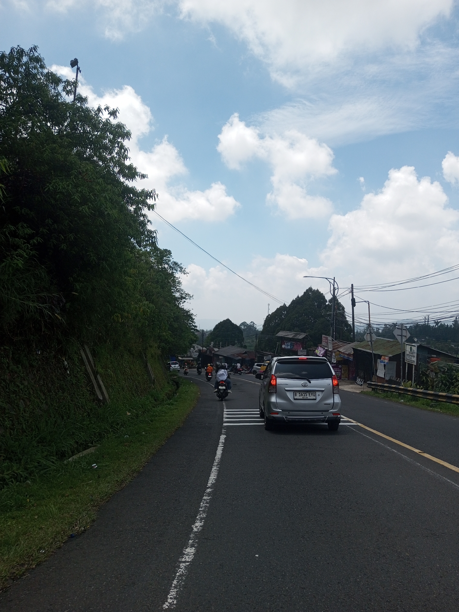 The image depicts a road scene with a silver minivan as the primary subject. The minivan is positioned in the center lane, identifiable by white painted stripes to its left and a solid yellow line to its right. A license plate is visible on the minivan. Motorbikes are present ahead of the minivan and to its left. The road is bordered on the left by a heavily vegetated embankment. On the right side of the road, there are commercial establishments. Overhead, there are electrical lines. The sky is blue with cumulus clouds. The image does not contain enough information to confirm the location.