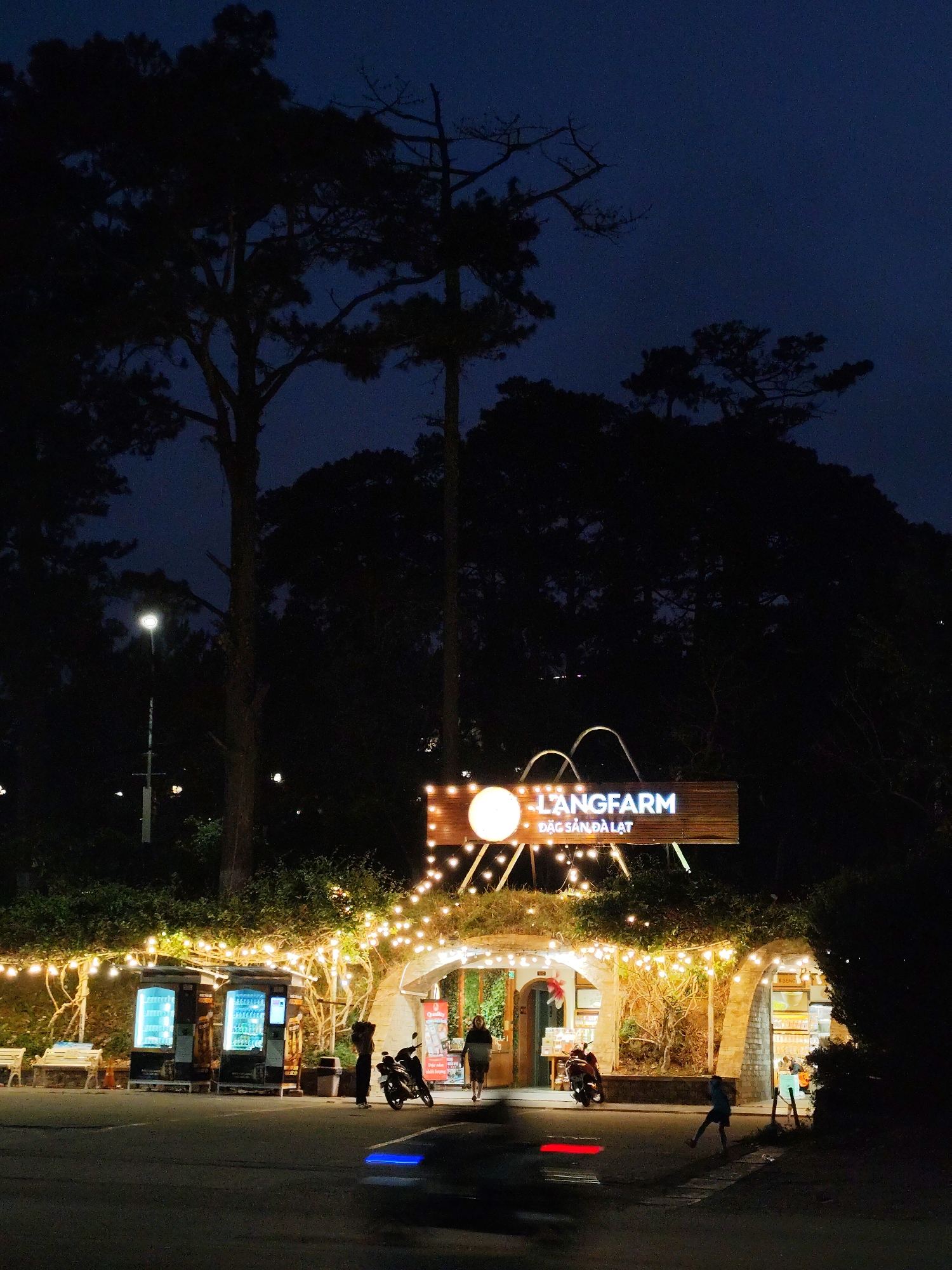 entrance to Langfarm in Da Lat, Vietnam, at night. Above the entrance is a sign reading "Langfarm - Dac San Da Lat," illuminated by a row of lights. String lights also adorn the vegetation growing over the entrance arches. To the left of the entrance are two illuminated vending machines, and benches can be seen nearby. Several motorbikes are parked close to the entrance, and indistinct human figures are either entering or standing near the doorway. Vehicle lights blur across the road in the foreground, suggesting movement. Tall trees are visible in the background, silhouetted against the dark sky. A streetlight shines in the middle-left distance.