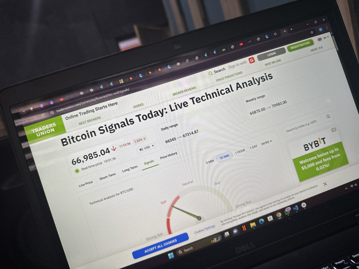This image displays a Dell laptop, angled from the left, presenting a cryptocurrency trading website within a dimly lit indoor environment in Jos, Nigeria. The screen is centered on the "Traders Union" website (tradersunion.com), specifically a page titled "Bitcoin Signals Today: Live Technical Analysis." The current Bitcoin price is prominently shown as $66,985.04, indicating a recent decrease of $1110.96 (1.63%), with a real-time price update at 10:01:36. Visible data includes a daily range of 66345 - 67314.87 and a weekly range of 65870.00 - 70983.00. An advertisement for "Bybit" offering a welcome bonus up to $5,000 is displayed on the right side of the screen. A technical analysis gauge is present, indicating a "Sell" recommendation. The laptop's "Dell" logo is visible below the screen. The background is out of focus, suggesting faint vertical lines, potentially part of a wall or furniture in the room. No individuals are visible in the scene.