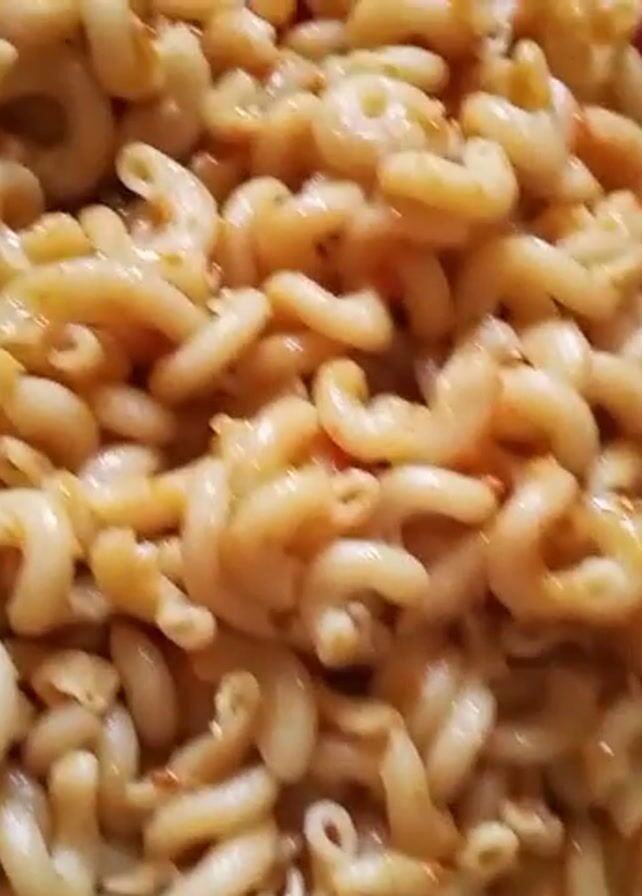 A close-up shot shows a pile of cooked fusilli pasta in a red square dish. The pasta appears to be coated in a light sauce. The dish sits on a surface with a patterned tile. The camera is static.