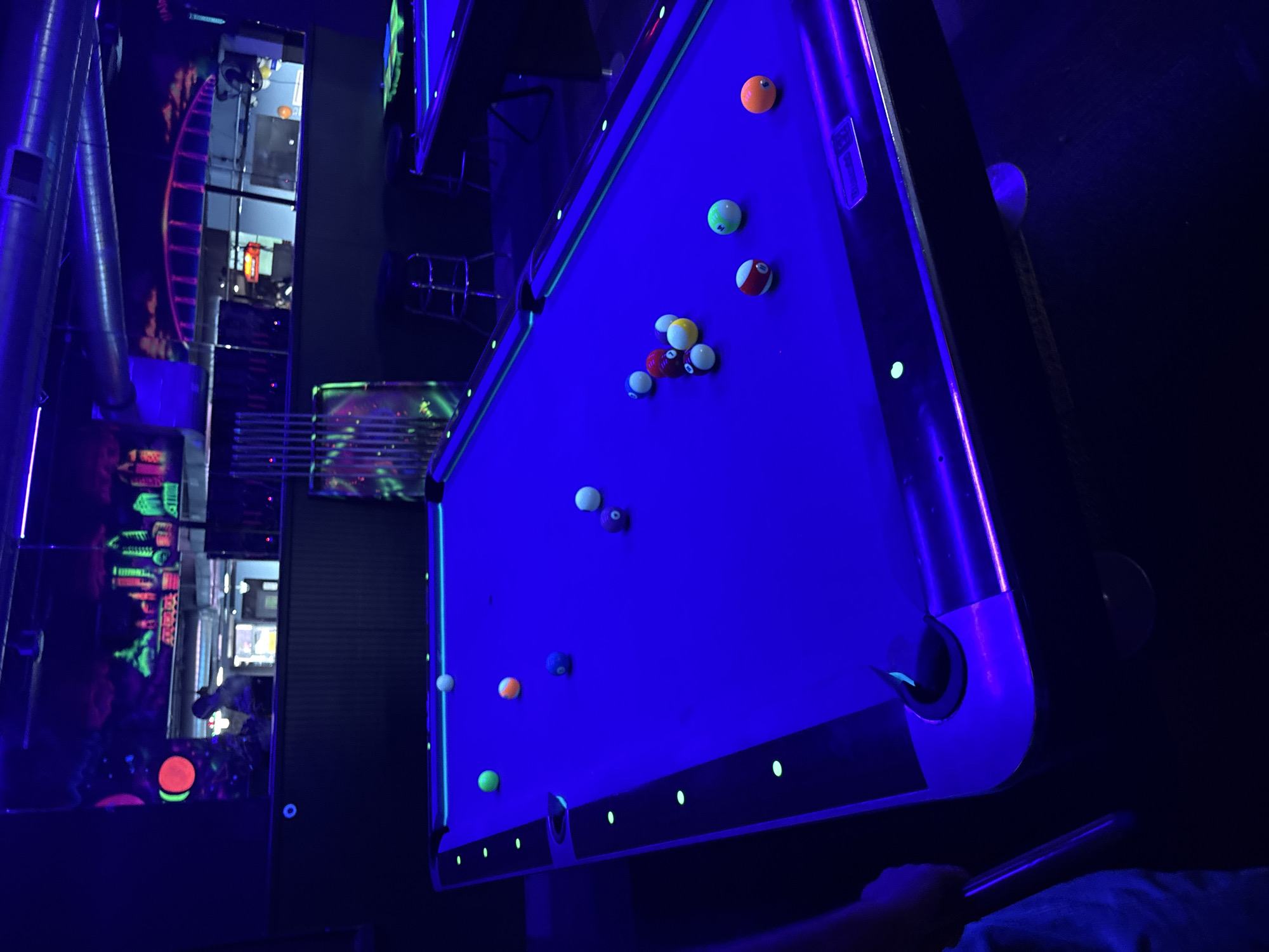 The image depicts a pool table under blue fluorescent light with pool balls scattered across its surface