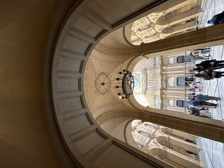 The image displays the Plaça de Santa Maria and the facade of the Basilica at the Montserrat Abbey, located in Monistrol de Montserrat, Spain. The scene is viewed from beneath a wide, light-colored stone archway with a vaulted ceiling. The archway's interior is decorated with rectangular stone panels and a painted inscription in Latin, partially visible as "DIVM MIRACVLVS SER" and "IN MONTE VT SOLVS". A multi-branched, dark metal chandelier with exposed bulbs hangs centrally from an elaborate circular motif on the ceiling. Below, an open square or courtyard features a light-colored geometric patterned floor. The courtyard is bordered by multi-story buildings with archways, windows, and balconies, exhibiting an ochre and reddish-brown color palette. Numerous individuals, appearing to be visitors or tourists, are dispersed across the courtyard, standing and walking. Their attire is casual. In the background, the ornate stone facade of the Montserrat Basilica rises prominently. It features multiple tiers of architectural detailing, including numerous statues in niches, decorative carvings, and several arched doorways, some painted blue. A large circular clock with Roman numerals is situated above the central entrance. Two dark rectangular display screens are mounted on the facade to the left and right of the main central doorway. Natural daylight illuminates the courtyard and the building facade.