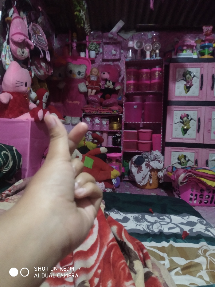 This image depicts the interior of a room located in Cipinang, Indonesia, characterized by a predominantly pink color scheme and extensive character merchandise