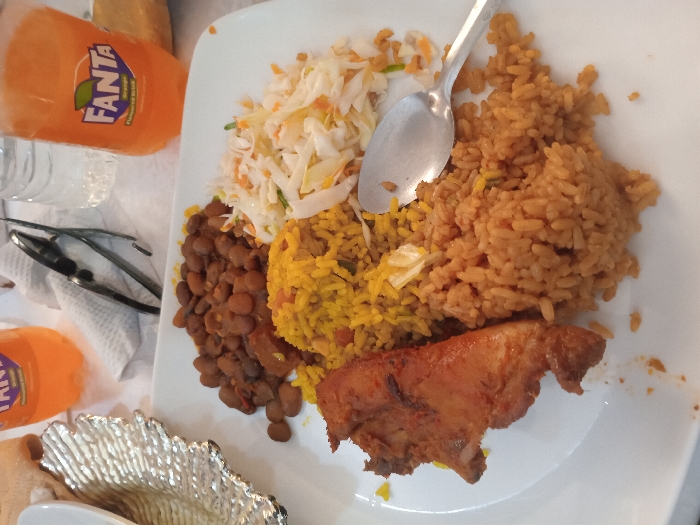 - "A white plate with a meal consisting of fried chicken, two types of rice, coleslaw and beans, located in the city of Kaduna Junction, Nigeria at latitude: 10" by FM-C4Onu1, licensed under CC BY 4.0