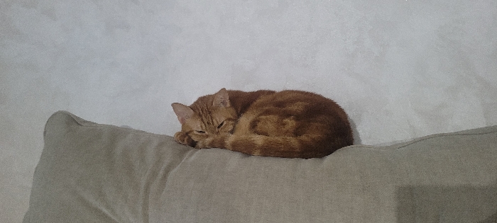 An indoor scene, located in Hydra, Algeria, displays a single ginger tabby cat resting. The cat is curled into a compact form, positioned on a light beige or tan upholstered surface, likely a sofa backrest or cushion. Its eyes are closed, and its head is tucked forward, resting on its front paws. The cat exhibits distinct orange and brown stripe patterns in its fur. The background consists of a plain, light-colored wall with a subtle textured finish. No other subjects or objects are distinctly visible.