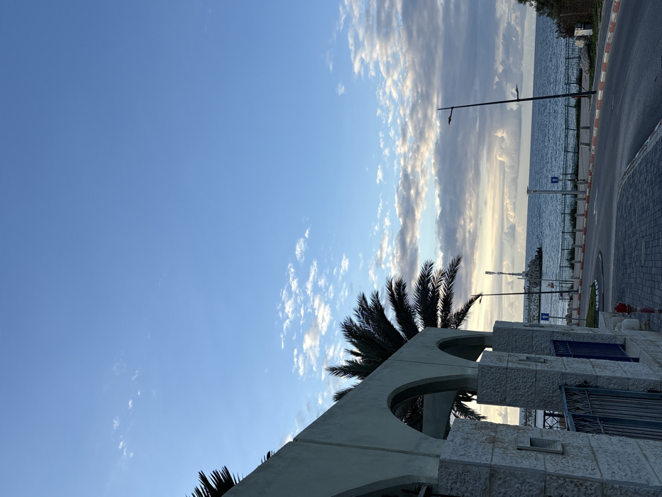 A sky with scattered clouds dominates the view. The scene includes a coastal building, partly visible in the foreground, with arched details and a palm tree behind it. A road runs along the water. Utility poles stand along the road.