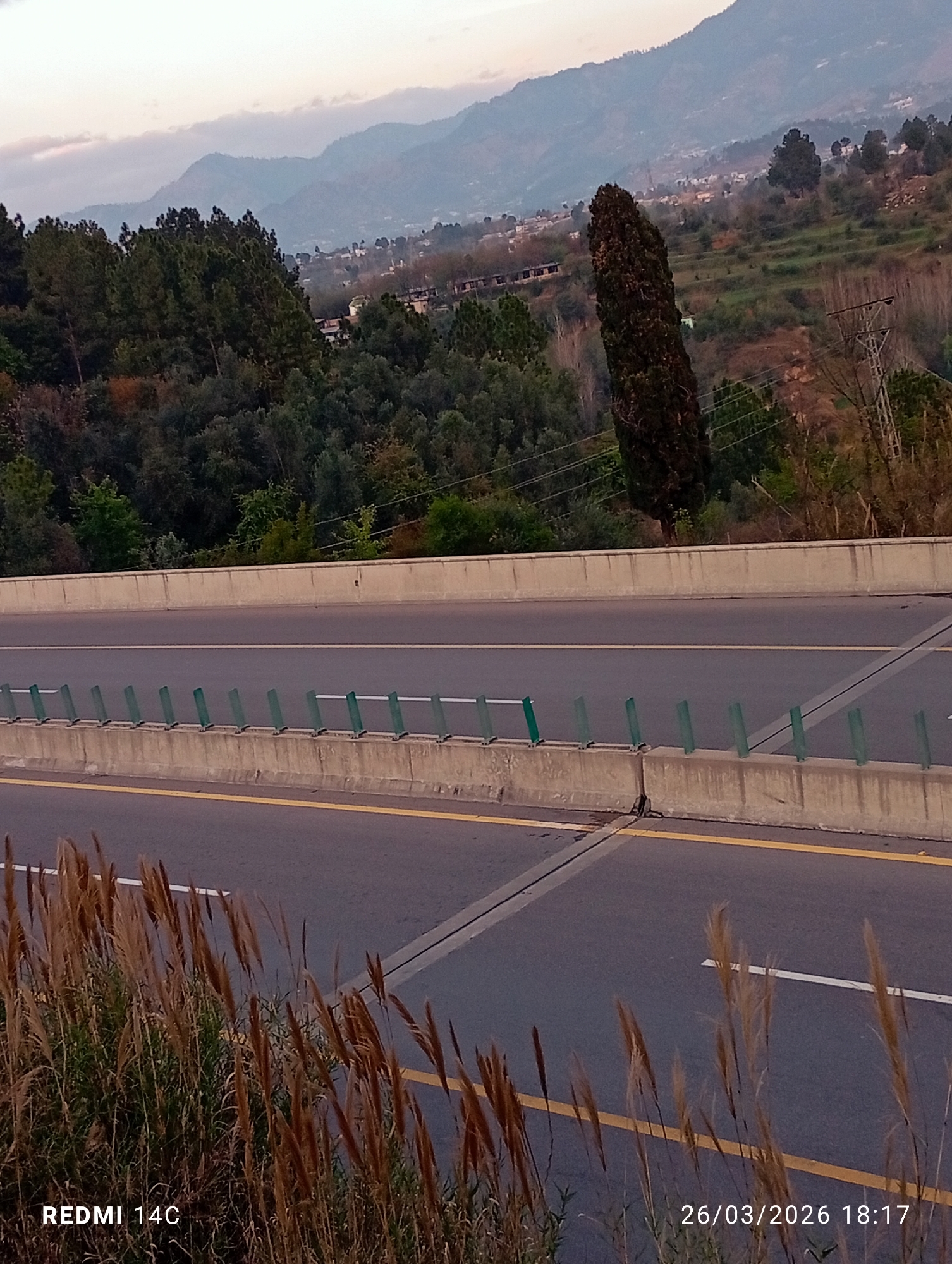 The image depicts an elevated view of a multi-lane highway or motorway in the vicinity of Grhala, Pakistan, during twilight conditions at 18:17 on March 26, 2026. In the foreground, tall, dry, brown-to-tan grass and reeds are visible along the lower edge and left side of the frame. The midground is dominated by a two-way asphalt highway. The lanes are separated by concrete median barriers approximately 1 meter in height, topped with regularly spaced, vertical, green-capped metal posts. The highway features yellow solid lines marking the shoulder and lane separation, and white dashed lines indicating individual lanes. No vehicles or pedestrians are present on the visible road surface. Beyond the highway, an upward sloping embankment is densely covered with a variety of trees, including coniferous (pine-like) and deciduous species, displaying shades of dark green. In the distant background, a series of layered mountains and hills rise, partially obscured by atmospheric haze. Scattered residential or small commercial structures are visible amidst the distant vegetation on the lower mountain slopes. A tall, dark, columnar tree, possibly a cypress, stands prominently on a mid-distance hillside to the right of the center. A metal utility pylon with overhead lines is discernible on the far right slope. The sky is a pale blue-grey, indicative of late evening light.