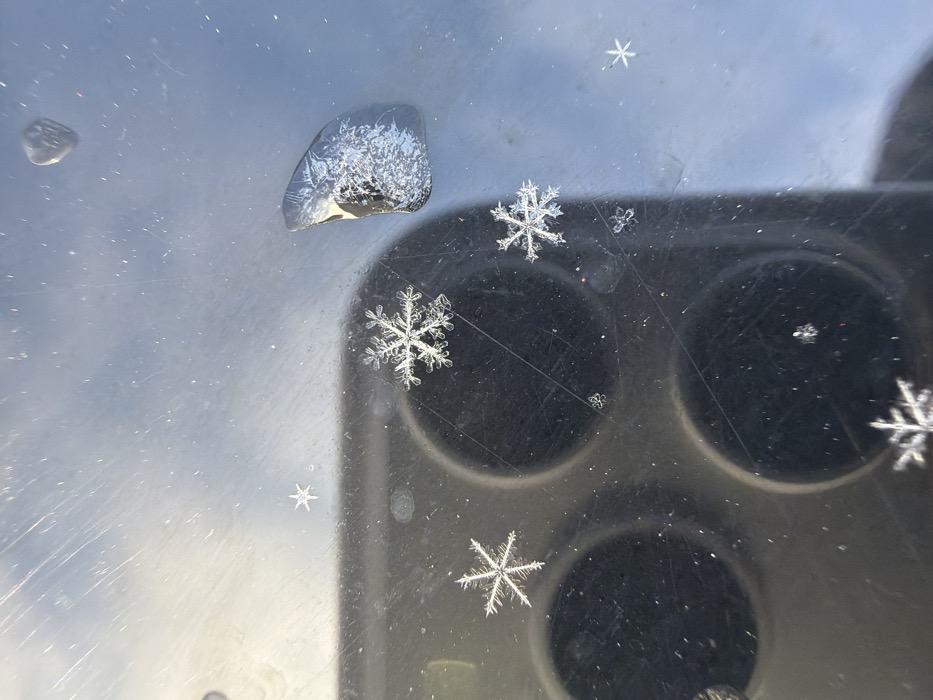 The image displays a macro view of multiple crystalline snowflakes resting on a dark, scratched, and reflective surface. The reflection of a smartphone's triple-lens camera array is prominently visible, occupying the lower-left to central portion of the frame. The surface exhibits numerous fine linear abrasions and faint dust particles. Several distinct, intricate hexagonal dendritic snowflakes are present, with one prominent specimen located slightly left of the center, another in the upper-right quadrant, and a third partially visible in the lower-left. Smaller, less defined snow crystals and a fragmented, amorphous patch of ice are also discernible. The upper-right background reflects a lighter, possibly sky-like, ambient light. There are no individuals present, nor are any direct actions or interactions depicted beyond the static arrangement of snowflakes on the surface. The specific location within Hrodna, Belarus, cannot be identified from the visual information provided in this close-up photograph. The scene suggests an outdoor environment during cold, snowy conditions.