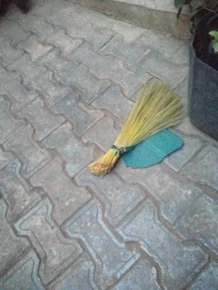 The scene depicts a paved outdoor area in Bukuru, Nigeria. The ground is constructed from interlocking grey concrete blocks, arranged in a repeating pattern and showing signs of general wear and light accumulation of dirt. A small, natural fiber broom with light yellow bristles is oriented diagonally in the mid-right of the frame, its handle end pointing towards the lower left. The bristles are bound together with a dark green band. Resting immediately to the left of the broom's bristles, and partially obscured by them, is a flat, teal-colored object, consistent with a small dustpan or mat. In the upper right corner, a portion of a dark, rectangular planter containing green foliage is visible. No individuals are present in the image.