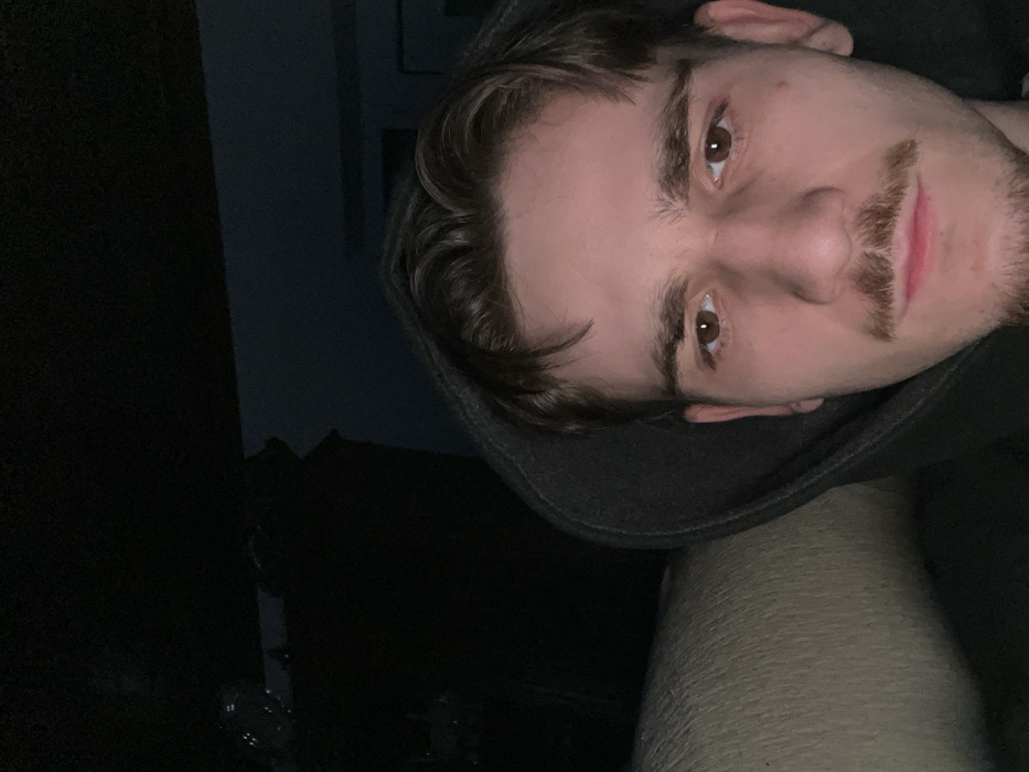 A person with light skin, dark brown hair styled with a slight wave, and brown eyes looks at the camera with a serious expression. They have a neatly groomed mustache. A dark-colored hoodie frames their face, with part of their arm visible beneath the hood. The background is dark, with some blurred shapes visible on the left side. The image is slightly rotated, causing the person to appear sideways.