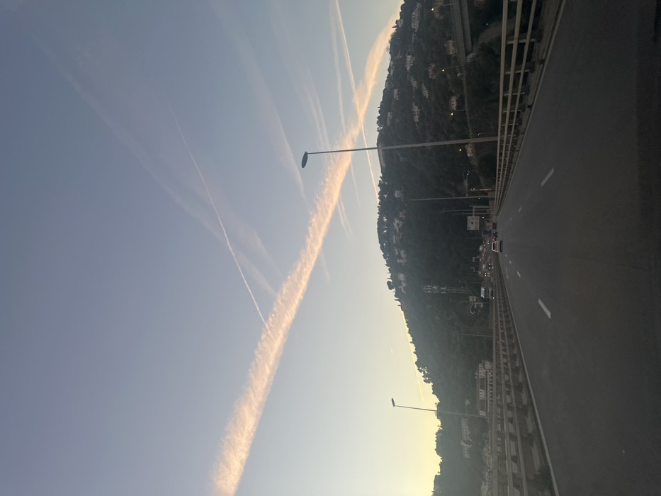 The image depicts a multi-lane highway at either dawn or dusk, observed from a low perspective, likely from within a moving vehicle. The asphalt road, marked by white dashed lines, extends into the distance, accommodating three visible lanes. Approximately five vehicles, primarily light-colored cars, are observed traveling in the same direction ahead on the highway. A large white truck is partially visible on the far left. The highway is flanked by concrete barriers and metal railings. On the left, beyond the barriers, a lower-level road or structure is visible, followed by a vegetated hillside with sparse buildings. On the right, a steep, densely wooded hill rises, its slopes populated with numerous white residential buildings. An overpass structure crosses above the highway in the mid-ground on the right. Two tall streetlights, each with a single dark luminaire, are positioned along the highway, one on each side, in the mid-ground. A prominent communications tower is visible on the left side of the main hill. A tunnel entrance is faintly visible in the distance on the highway. The sky is a pale blue transitioning to a deeper hue overhead, marked by multiple contrails. One broad, diffuse, light orange/pink contrail stretches diagonally from the lower left to the upper right, intersected by a thinner, fainter contrail from the upper left. The warm coloration of the contrails indicates the sun is low on the horizon, outside the frame. The scene is located in Nice, France, specifically on the A8 Autoroute (E80). The view is consistent with traveling westbound (towards Marseille) after passing the Nice Est exit (Exit 52), with the prominent residential hill on the right being Mont Alban.