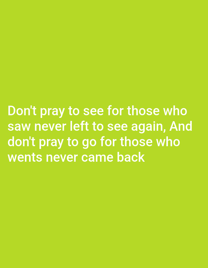 This digital image features white text displayed against a solid lime green background, within the digital realm of Unknown, Unknown. The text is centrally aligned in a sans-serif font, occupying the lower-middle portion of the frame. The message reads: "Don't pray to see for those who saw never left to see again, And don't pray to go for those who wents never came back". No individuals, physical objects, or discernible environments beyond the color field are present.
