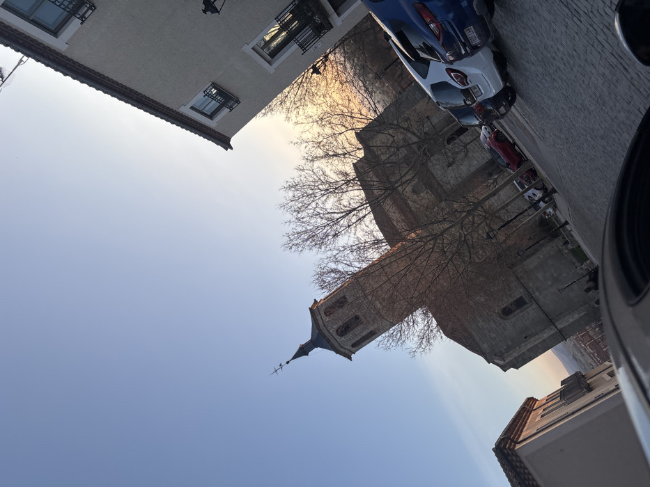 The image depicts an urban street scene in Ávila, Spain, featuring the Church of San Nicolás de Bari. The church, constructed of stone blocks, presents a prominent bell tower with arched openings, topped by a dark, pointed spire and a cross finial. Several bare-branched deciduous trees stand in front of the church. To the right, a multi-story building with a light-colored facade, dark-framed windows, and small balconies is visible, with a black street lamp attached to its exterior. To the left, a portion of another light-toned building with a tiled roof and a balcony is present. A cobblestone street runs horizontally across the mid-ground, where a line of vehicles is parked. These include a blue SUV displaying Spanish license plate "1905 LHH" and a white SUV, among others. The scene is illuminated by the low sun, visible as a warm yellow-orange glow on the horizon to the right, against a clear, bright blue sky. The photograph is taken from a low, tilted perspective, likely from inside a vehicle, with its dark roofline visible in the immediate foreground. No individuals are discernible.