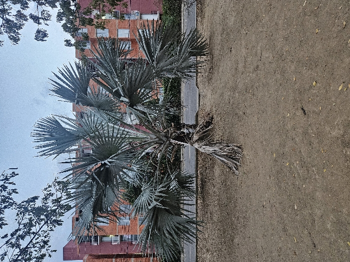 A young palm tree stands in a dirt plot next to a narrow paved path. The tree features large, fan-shaped, silvery-green fronds. Behind the tree, an orange brick building rises multiple stories, with a pattern of windows visible on its facade. Part of another tree appears on the left with only its bare branches visible. The sky is overcast and grey, creating a muted color palette for the scene.
