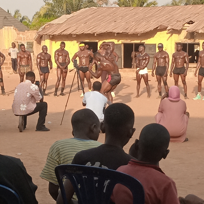 A group of oiled-up bodybuilders in various poses stand before an audience. A man with a camera on a tripod films them. Some audience members sit on chairs while others stand or sit on the ground. Most face the bodybuilders. A building with a simple, sloping roof is visible in the background. The scene appears to be outdoors in a community setting.