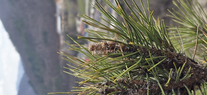 - "The scene depicts a conifer branch with green needles in the foreground, displaying a brown, fibrous object, approximately 3-4 cm in length, resembling a chrysalis or a camouflaged insect larva, positioned among the needles" by FM-OUQug1, licensed under CC BY 4.0