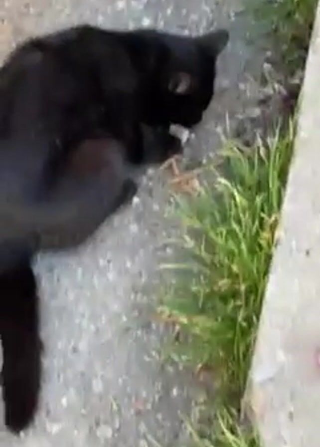 A black cat is seen outside on a paved surface next to a curb and some green grass and plants. The cat is crouched, and it appears to be eating something white off the ground. It then appears to cough or gag. The cat then stands up, twitches slightly, and walks behind the tire of a blue car.