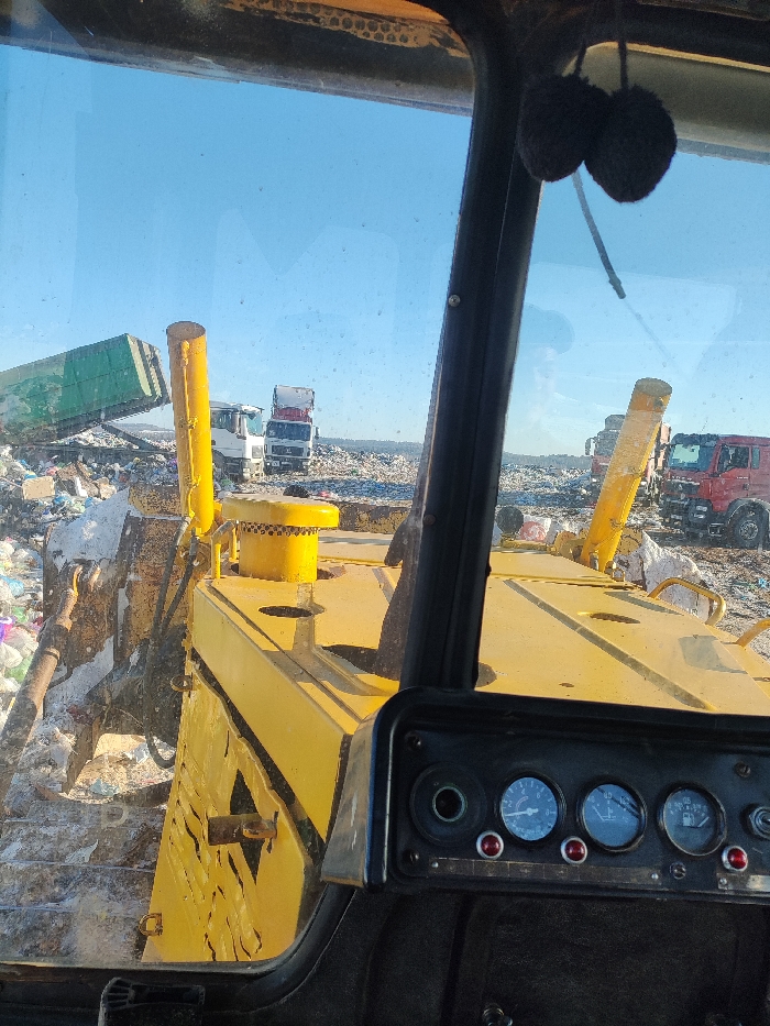 The image presents a view from inside the cab of a yellow heavy-duty bulldozer at a waste disposal site in Svetlyi, Russia