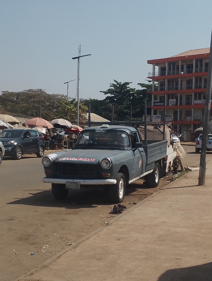 An aged, light blue-grey Peugeot 404 pickup truck is stationary, parked on a dirt shoulder alongside a paved road, facing the viewer. The vehicle exhibits visible wear, including paint chips and dirt. Red lettering on the hood reads "MY MOBIKASH." A white front bumper is present, and the license plate, partially obscured, displays "LAGOS" at its base. A person is discernible in the driver's seat. The truck's flatbed cargo area is covered by a brown tarp or fabric. To the left of the truck, a dark-colored SUV is partially visible on the road, while further left, multiple market stalls with large, distinctively colored umbrellas (red, white, and brown) line the street. Several indistinct figures are visible near these stalls. The immediate foreground features a concrete sidewalk running parallel to the road. The ground surrounding the truck and leading to the market stalls is unpaved, dusty earth with scattered debris. In the mid-ground and background, dense green trees are visible. To the far right, a multi-story building with white walls and prominent orange-trimmed balconies and window frames stands tall, suggestive of a commercial or residential complex. Tall streetlights with what appear to be solar panels are positioned along the street. The sky is clear and light blue, indicative of a sunny day. This scene depicts a bustling urban commercial street environment, consistent with a market area in the city of Abuja, Nigeria.
