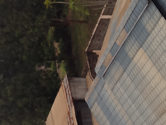 This image depicts an outdoor scene in Kikuyu Township ward, Kenya, focusing on architectural elements and natural foliage. In the foreground, a large, sloped roof constructed of light grey and off-white corrugated metal tiles, arranged in an interlocking pattern, extends from the bottom-left to the center. Portions of this roof exhibit brownish discoloration or dirt. To the mid-left, a smaller structure is visible, featuring a weathered, rust-colored corrugated metal roof and corrugated metal walls. Directly behind and to the right of this smaller structure, a retaining wall made of dark grey concrete blocks, with a lighter coping, separates a lower ground level from an elevated, grassy area. Several vertical supports, also constructed from concrete blocks, are integrated into the retaining wall. The background consists of dense, dark green trees and foliage, with patches of lighter green grass visible on the ground beneath them. A slender, lighter green plant is partially visible on the far right edge of the frame. No individuals or active subjects are present.