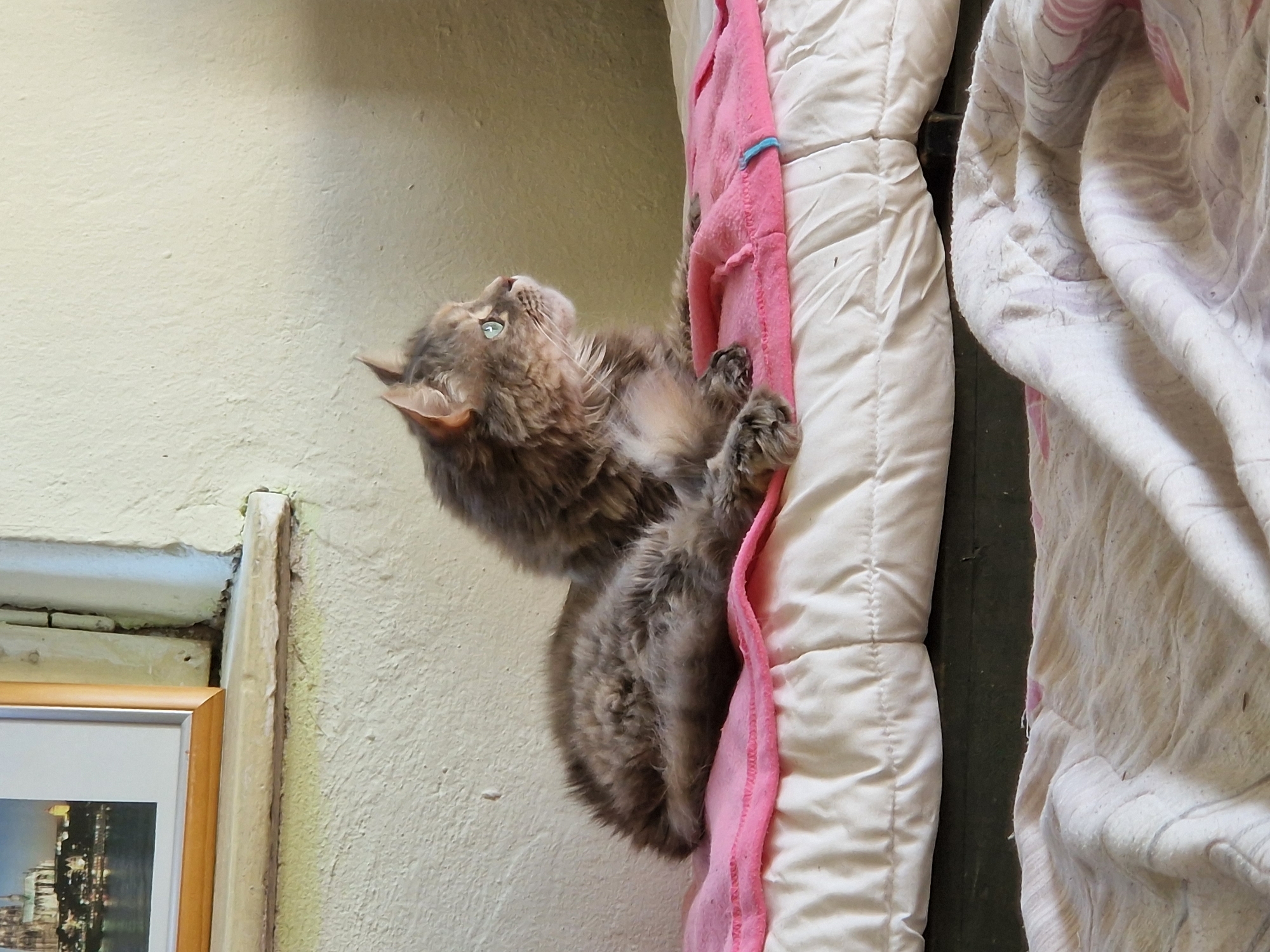 A medium-sized, fluffy, gray tabby cat is clinging to a folded, white and pink blanket that is leaning against a pale yellow wall. The cat is facing upward, with its paws holding onto the pink layer of the blanket. A framed picture hangs on the wall to the left of the blanket. The location is Raduvene, Bulgaria.