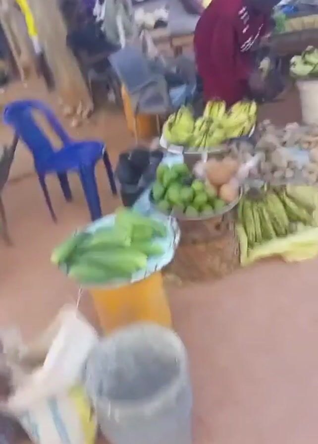 bustling outdoor market. People are browsing and buying fruits and vegetables like bananas, cucumbers, and yams. One shot shows a young boy carrying a white sack near a trash can. Other shots focus on different vendors displaying their produce. The camera then pans to show a road with a yellow auto rickshaw, also known as a "keke napep," driving by. The overall setting is a typical market scene in an urban or semi-urban area.