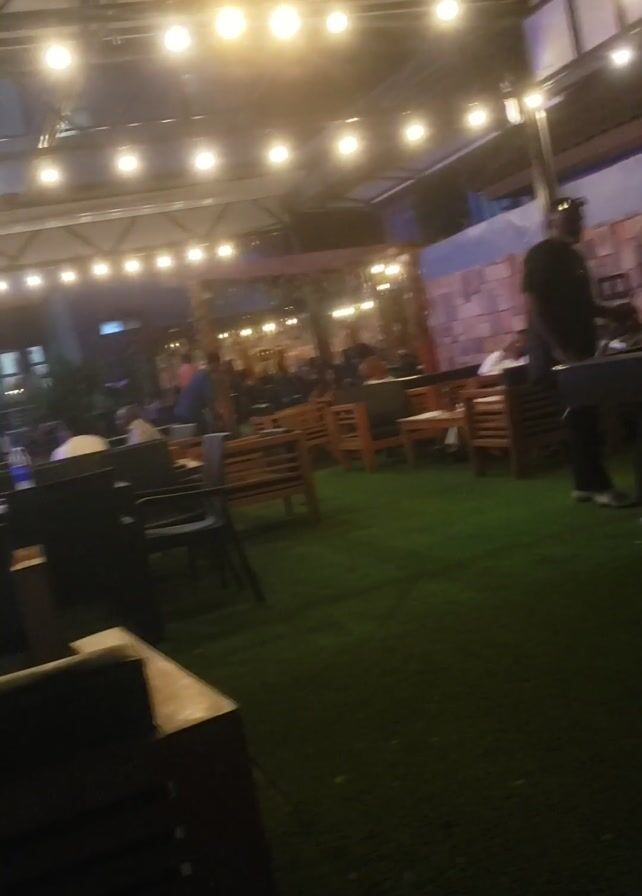 dimly lit outdoor restaurant or event space at night. The space is covered with a metal frame and strung with many small, warm-toned lights. There are numerous tables and chairs, mostly made of wood, where people are seated. At the front, two individuals are seen setting up equipment on a raised platform or stage. The overall atmosphere is lively, but details are somewhat obscured due to the darkness.