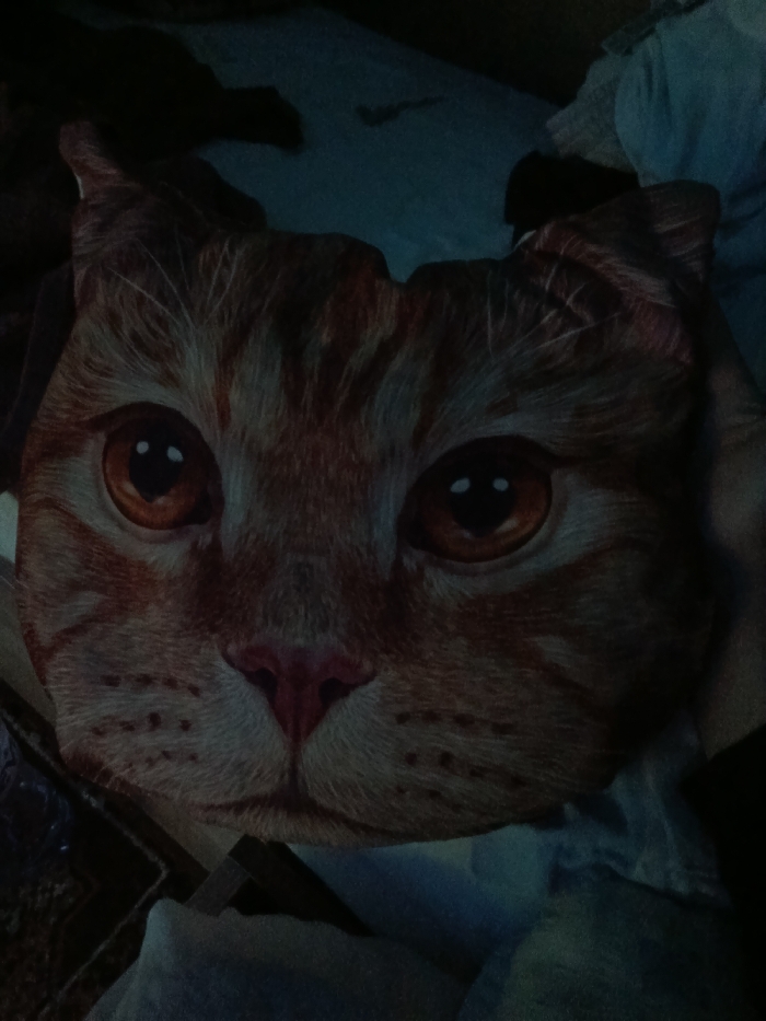 This image depicts an indoor scene, presumed to be located in Kavarna, Bulgaria, under low light conditions. The primary subject is a fabric pillow or cushion, designed to resemble the face of an orange tabby cat. The cat's face exhibits distinct amber-colored eyes with round black pupils, a small pink nose, and faint markings suggesting whiskers and fur texture. The coloration is predominantly shades of orange and brown, with darker stripes. A human hand, partially visible on the right side of the frame, is holding or supporting the cat-face object. The background is blurred and dark, consisting of indistinct textile items in shades of blue, grey, and black, consistent with bedding or other soft furnishings. No other people, specific objects, or significant interactions are discernible.