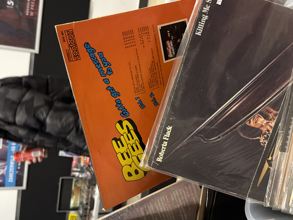 The image displays an indoor setting focused on a collection of vinyl records. In the foreground, a prominent orange record sleeve for "BEE GEES Gotta get a message to you" is visible, featuring track listings for Side 1 and Side 2, and marked "STEREO contour 2870 404" with a (P) 1974 copyright. A smaller image titled "Bee Gees Mr. Natural" is also on this sleeve. Below it, a black record sleeve for "Roberta Flack," partially titled "Killing Me Softly" and encased in clear plastic, shows a portion of the artist's face. Other record sleeves are partially visible underneath. In the background, a person wearing a black puffer jacket is seen from the chest up, holding a red can in their right hand. The environment features dark walls and partially obscured posters displaying text such as "ZARZEŻERM" and "KB." A table or counter with additional items, including a metallic case, is present. The scene is located in the city of Lublin, Poland.