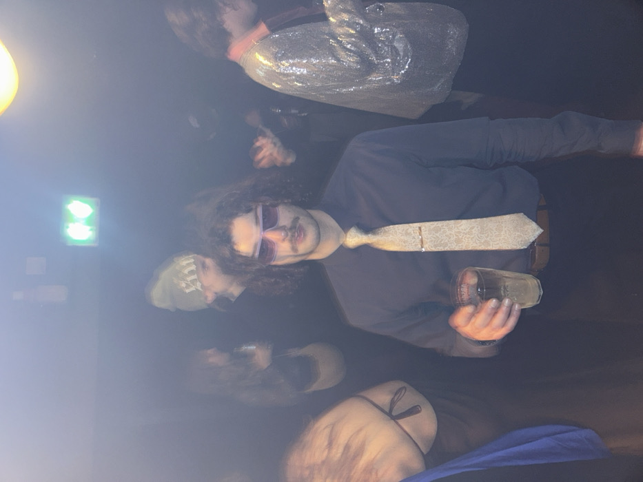 A person with curly hair, a mustache, and pink sunglasses wears a dark shirt and patterned tie while holding a glass. A glowing exit sign is visible in the background, along with several blurred figures. One figure is wearing a sequined top, another a light-colored beanie. There's dim lighting with a bright light source at the top left. The image is slightly blurry and appears to be taken indoors, possibly at a party or gathering.