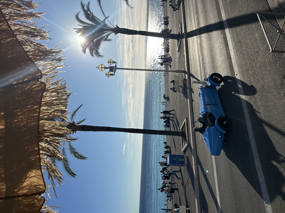 The image depicts a sunlit coastal scene along the Promenade des Anglais in Nice, France, on a clear day