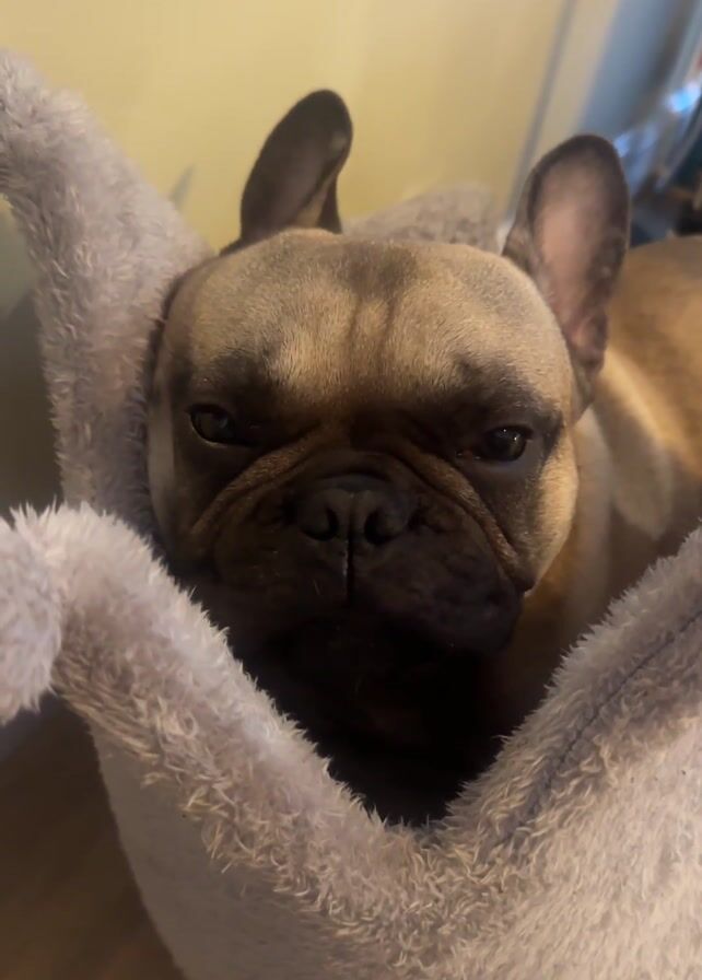 A brown French bulldog rests in a grey, fuzzy, plush dog bed
