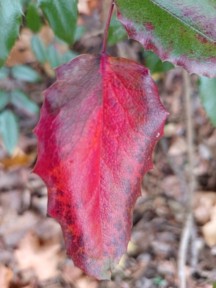 - "A single, sharply defined leaf, likely from a Mahonia or similar evergreen shrub, is centrally positioned and vertically oriented" by FM-rFWs12, licensed under CC BY 4.0