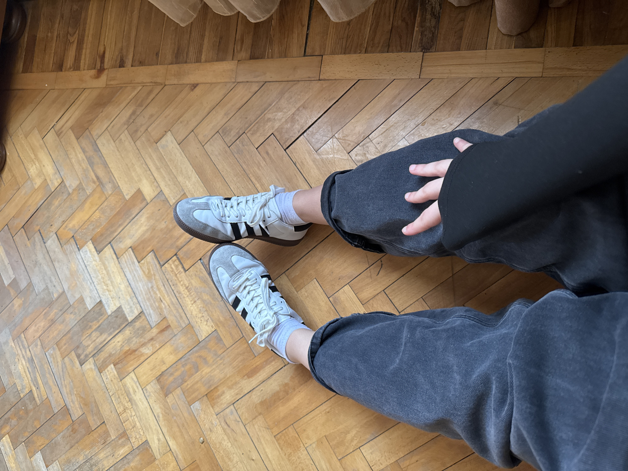 The image captures a first-person perspective of an individual's lower body in an indoor setting within Nor Artamet, Armenia. The subject is wearing loose-fitting, faded grey denim jeans, white ankle socks, and light grey and white Adidas Samba-style sneakers featuring black stripes and brown gum soles. The individual's left hand, partially covered by a black long-sleeved garment, rests on the upper part of their left leg. The legs are extended forward. The flooring beneath the subject is composed of light brown wooden parquet arranged in a herringbone pattern, showing signs of wear and varying tones. A distinct vertical section of wood flooring runs along the right side, perpendicular to the parquet pattern, bordering a light-colored, textured object that is partially visible on the far right.