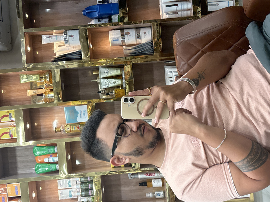 An indoor scene in South Dumdum, India, depicts a male individual taking a mirror selfie. The male, positioned in a brown, padded salon chair, faces slightly to his right, holding a light-colored smartphone in his right hand to capture his reflection. He possesses short, dark hair styled with a fade, a short beard, and wears black-framed glasses. His attire includes a light peach-colored short-sleeved t-shirt. Visible accessories are an earring in his left ear, a silver bracelet on his left wrist, a patterned tribal tattoo on his left forearm, and on his right forearm, a rose tattoo above a cross and text, along with two gold-toned rings on his right hand. The background is a mirrored wall reflecting illuminated display shelves with golden frames and wooden interiors. These shelves are stocked with various beauty and cosmetic products, including bottles, jars, tubes, and boxes, some labeled "GOLD." Specific items include green, clear, and blue-packaged products. An air conditioning unit is visible in the upper right portion of the reflection.