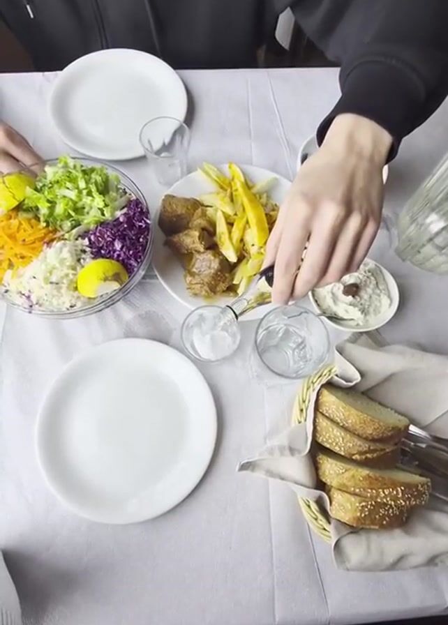The video captures a dining table covered with a white tablecloth, where two people are preparing to enjoy a meal. A person wearing a black hoodie is using a tool that appears to be a small bottle opener or serving utensil to add something to a glass of water. The table is set with two empty white plates, a bowl of colorful salad with ingredients such as shredded lettuce, carrots, and red cabbage, a plate of meat and fries, a small dish of white dip, and a basket of sliced bread. There are also small glass cups with ice and a glass carafe visible on the table.