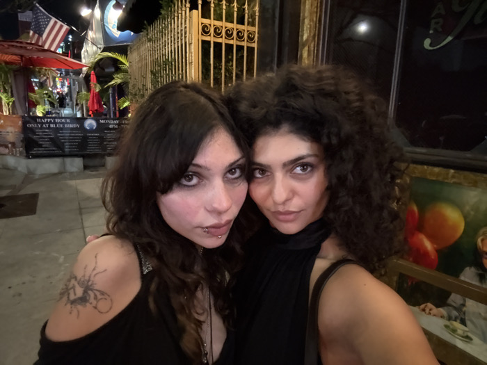 This nighttime image depicts two women posing outdoors in West Hollywood, United States of America