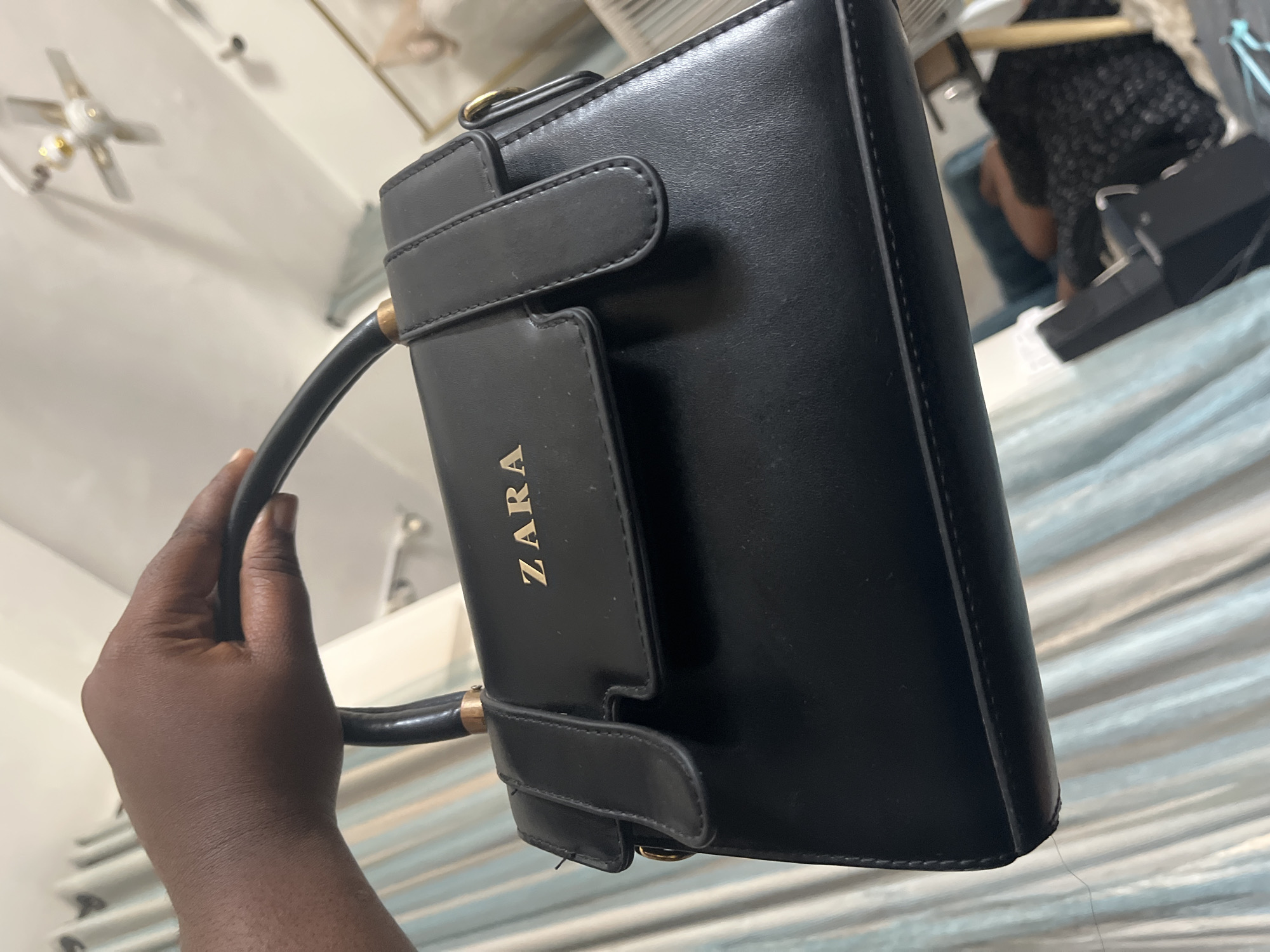 A dark-skinned hand is holding a black handbag by its top handle, which features gold-colored metallic hardware at its connection points. The handbag's front flap displays the word "ZARA" in gold capital letters. The background reveals an indoor setting. To the left, light-colored curtains with vertical stripes are visible. In the upper background, a white four-blade ceiling fan with central lighting is present, slightly out of focus. To the lower right, a blurred individual is seen reclining on what appears to be a bed or sofa, wearing dark, possibly patterned attire, with a blue headrest or pillow. Indistinct furniture, including a table with wooden legs, is also present in the background. The visual evidence does not provide specific details to pinpoint the exact location within the city of Barden Yana, Nigeria.