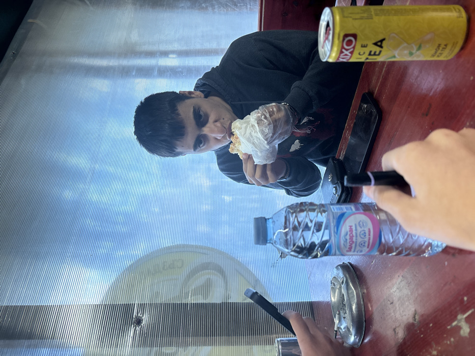 The image depicts a casual dining setting in Devin, Bulgaria. A male individual with dark, short hair, wearing a dark grey hooded sweatshirt, is seated at a reddish-brown wooden table. He is actively eating a food item, possibly a wrap or sandwich, held in both hands and partially encased in white paper, while wearing clear plastic gloves. On the table, positioned centrally, is an upright clear plastic bottle of "Балдаран" brand mineral water. To the left, partially visible hands belonging to another individual hold a black smartphone, with a metallic ashtray containing cigarette butts situated nearby. A small, black cylindrical object, possibly a vape pen, is held by one of these hands. Further right on the table, near the eating individual, a black smartphone lies face down, alongside a black wallet. A yellow can of "XIXO ICE TEA" (Lemon flavor) is visible on the far right of the table. The background consists of a translucent, corrugated plastic or polycarbonate sheet serving as a wall, through which a blurry light blue sky is discernible. A dark, circular mark is present on the upper left portion of this background material. Faint, circular branding is also vaguely visible through the translucent material on the left side.
