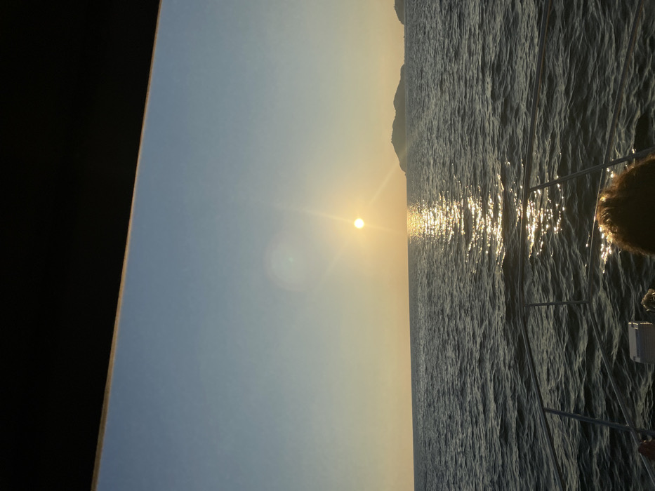 A horizontal seascape shows calm, dark water sparkling with sunlight reflecting from a low sun. A distant landmass is visible. Silhouettes of boat railings and a glimpse of a person's head appear on the right. To the left, a gradual color gradient ranges from black to a pale yellow-blue sky, where the sun shines brightly.