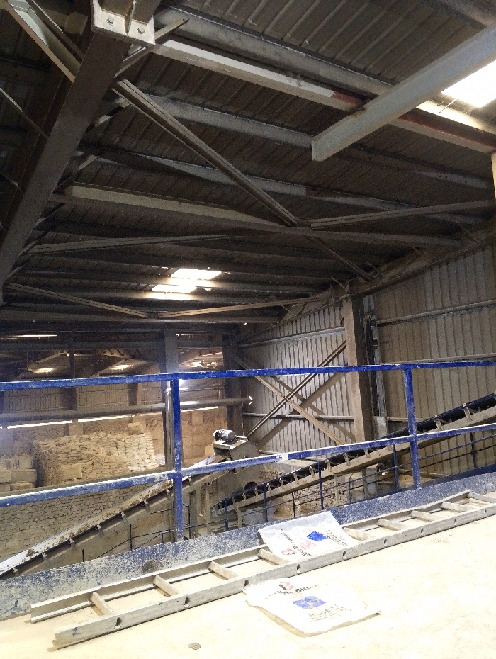The scene is a factory in Pangasia, Bangladesh, located at coordinates 22.693, 90.601. The factory appears to be a cement factory. A metal conveyor belt carries material from an unseen point. The conveyor belt is attached to a metal structure. The structure is supported by metal beams. The factory's interior is well-lit and the floor is dusty. The scene is taken from a vantage point overlooking the conveyor belt. A white bag lies on the floor below the conveyor belt. There is no one in the image.