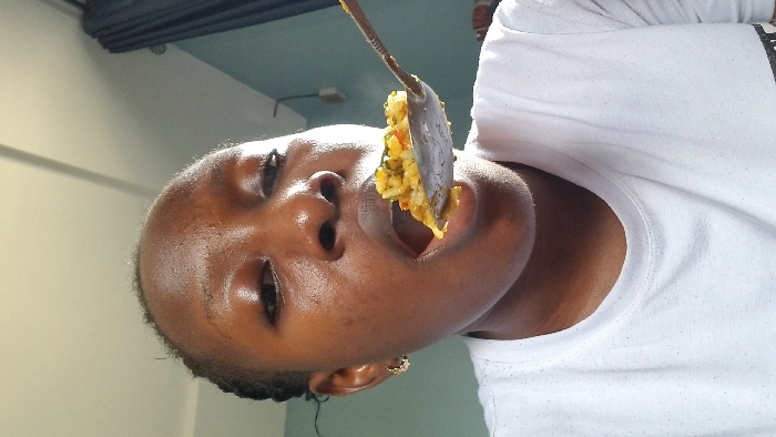 A close-up photograph captures a dark-skinned female subject in the act of eating. Her mouth is open wide, positioned to receive food from a metal spoon. The spoon contains a mixture of yellowish granular food, likely rice, intermixed with green and red particulate matter, indicative of vegetables and spices. The subject wears a plain white, short-sleeved, crew-neck t-shirt. A small, gold-colored hoop earring is visible in her left earlobe. The background reveals an indoor setting with a light blue wall. Above the wall, a white ceiling is visible, featuring a prominent horizontal strip, possibly a beam or trim. A dark-colored curtain or drape is partially visible on the far right side of the frame. This scene is located in a room within Ado-Ekiti, Nigeria.