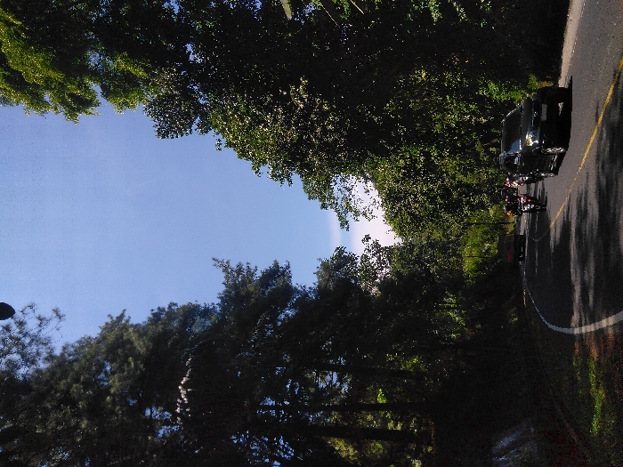 The image displays a sunlit, two-lane asphalt road curving to the left, depicted as being in Ottestad, Norway. The road surface is marked with a solid white line on the left edge and a solid yellow line on the right side of the visible lane. Dense foliage flanks both sides of the road; tall conifers dominate the shaded embankment on the left, while broadleaf deciduous trees with bright green leaves line the sunlit right side. Shadows from the trees are cast across the road surface. Vehicles are observed traveling in both directions. In the foreground on the right, a black SUV, consistent with a Toyota Rush model, is proceeding towards the viewer. Immediately behind it, a group of at least three motorcycles, each operated by a helmeted rider, also travels towards the viewer. Further in the distance on the left side of the road, an older, lighter-colored vehicle, possibly a sedan or small truck, is moving away from the viewer. The sky above is clear blue, indicating sunny weather. A dark, circular obstruction partially enters the top center of the photographic frame.