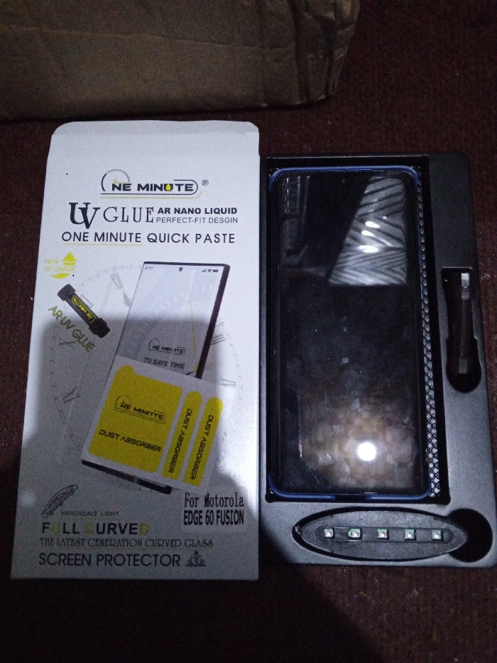 - "The image showcases a "Ne Minute" brand UV glue screen protector kit for a Motorola Edge 60 Fusion phone" by FM-sP5TE2, licensed under CC BY 4.0