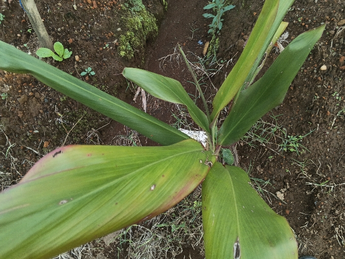 The scene, located in Siem Reap, Cambodia, depicts an overhead view of a plant growing in soil. The central subject is a plant with large, elongated, vibrant green leaves, some exhibiting reddish-brown edges and minor discolored spots. A small, dark-colored insect is present on the surface of one lower-left leaf. A crumpled piece of white, reflective material is situated near the plant's base. The immediate ground consists of dark brown, moist soil, interspersed with small stones and sparse green weeds. In the background, a distinct, linear depression runs through the soil, beyond which is additional dark brown earth and a mound of earth covered in green moss. A light-colored, thin, vertical object is partially visible on the far left side of the frame. No people or interactions are present.