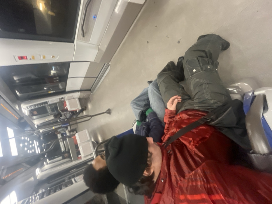 Two people are sitting on a bus. One person is wearing a red jacket, a black beanie, and has a black bag slung across their body. The other person has on jeans and dark pants. They are seated with their legs outstretched on the bus. The bus interior features grey floors and white storage compartments above the seats.