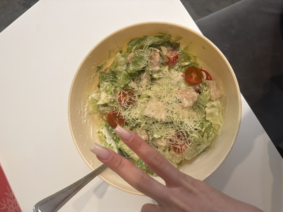 The image depicts an overhead view of a creamy Caesar-style salad in a light-colored bowl, positioned on a white surface. The salad contains chopped green lettuce, halved red cherry tomatoes, pieces of cooked meat (likely chicken), and is generously topped with grated white cheese. A silver-colored utensil handle is visible on the left side, partially extending into the bowl. A light-skinned left hand is positioned over the bowl, with the index and middle fingers extended in a V-sign. The fingers have elongated, square-shaped nails with a light pink or nude polish. A red and white patterned textile or placemat is partially visible in the upper left corner of the frame. The white surface transitions to a dark, possibly black, surface in the bottom right corner. No discernible landmarks or specific details in the image indicate a precise location within the city of Ruse, Bulgaria.