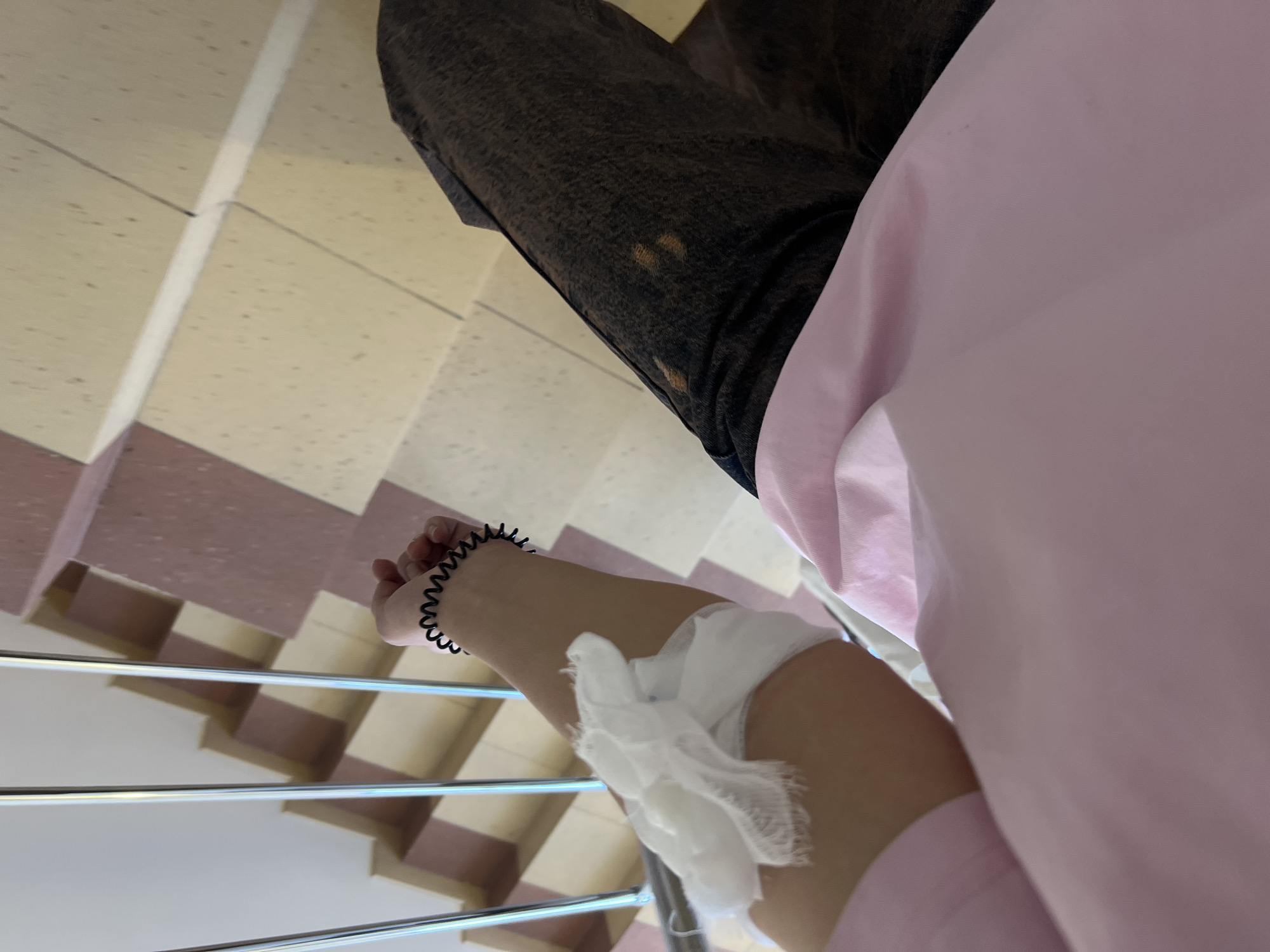 person sitting on stairs, possibly indoors, with their arm resting on a metal railing. The person is wearing dark jeans and a light pink shirt. A white bandage is wrapped around their forearm. The background consists of light-colored stairs with alternating shades, creating a pattern. The location of the image is not specified. Therefore, it is not possible to verify if it is from the city of Krasnoyarsk, Russia.