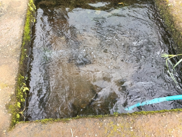 The image depicts an overhead view of a rectangular concrete basin or channel containing flowing, agitated water, located in Khna, Cambodia. A light blue-green hose is partially submerged in the lower right, actively discharging water into the basin and creating visible turbulence and ripples on the water's surface. The water appears slightly murky. The concrete edges of the basin, particularly along the left and bottom, are covered with dense green moss and minor vegetative growth, indicative of a damp environment. Additional thin green plant stems are observed emerging from the water along the right edge. No individuals or additional objects are visible within the frame.